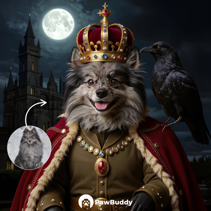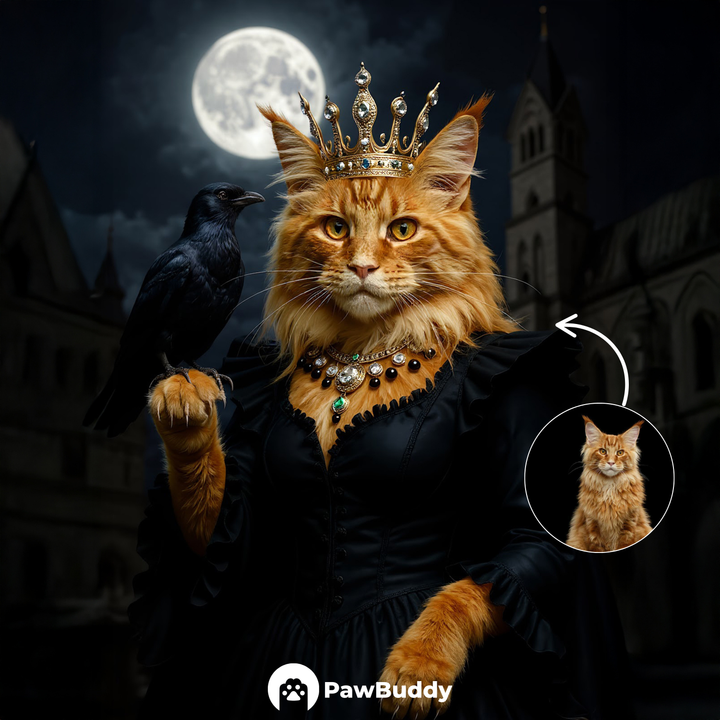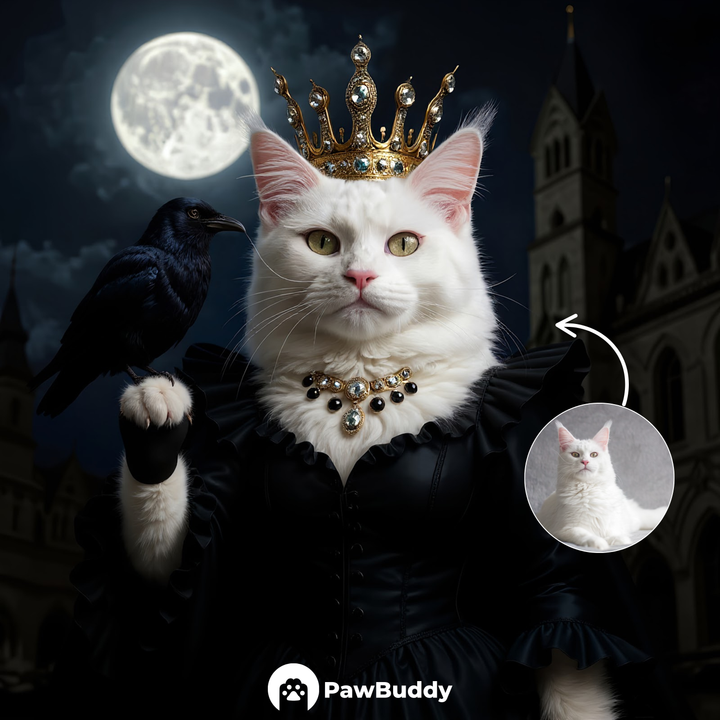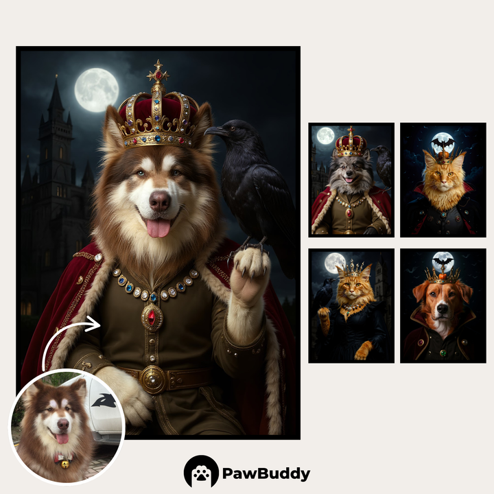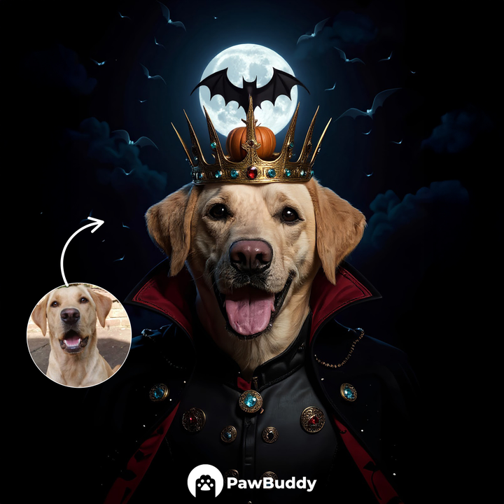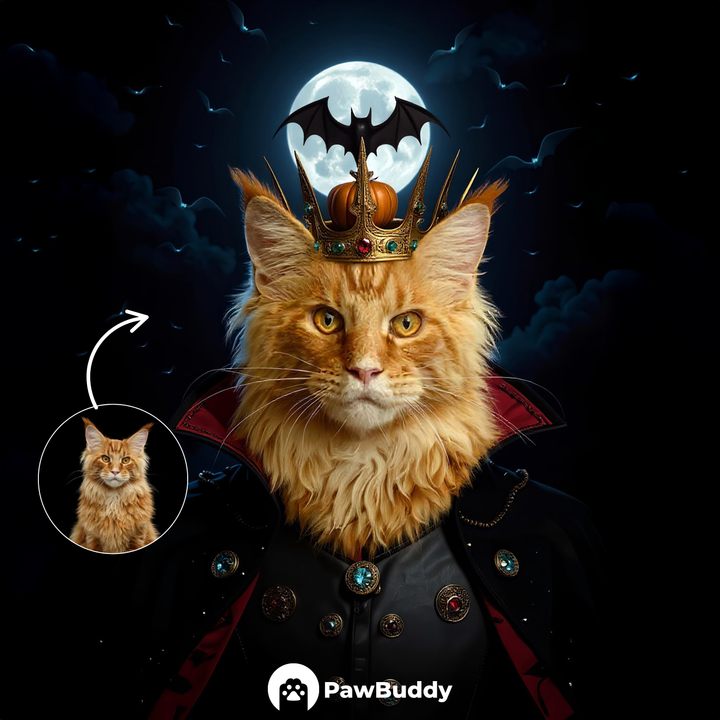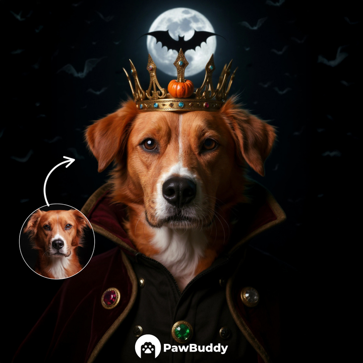This concept showcases your pet as a majestic vampire, complete with a royal crown and luxurious attire, set against a dark, mystical backdrop. The full moon illuminates the scene, casting an eerie yet regal glow. Your pet's powerful vampire presence shines through as they stand tall, surrounded by bats and mystical shadows. Perfect for those who want to capture the dark allure of Halloween royalty, this portrait brings out your pet’s inner vampire king or queen, with a touch of mysterious grandeur. This concept offers three background options for you to choose from, tailoring the atmosphere to fit your pet’s vampire persona.