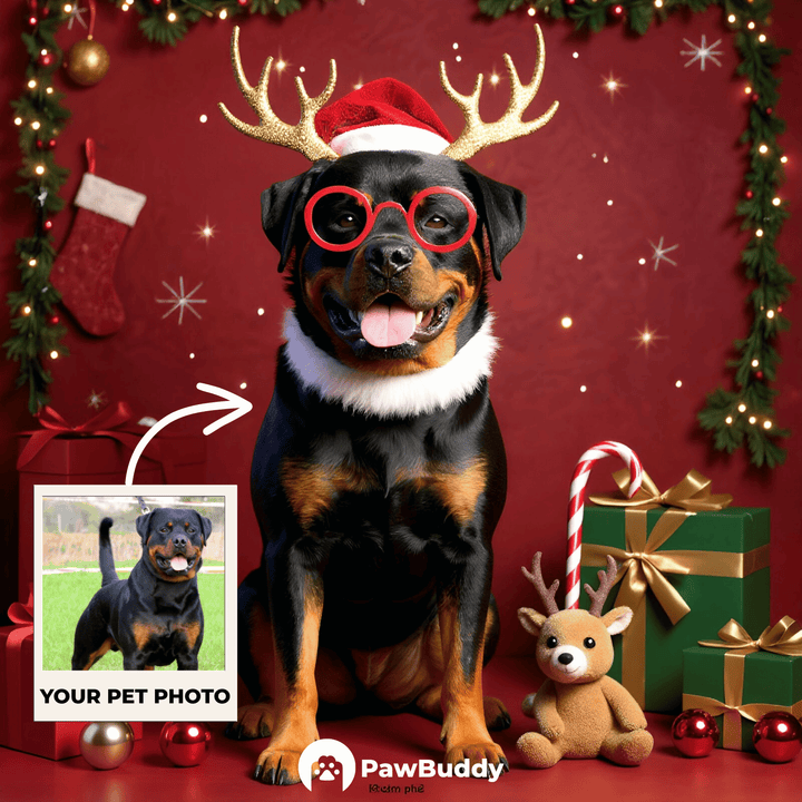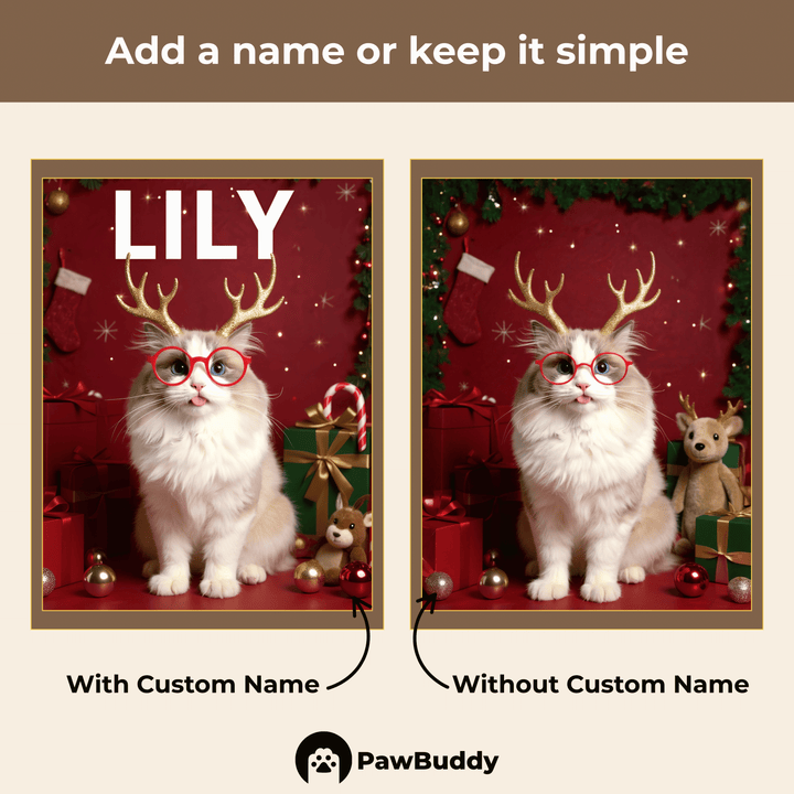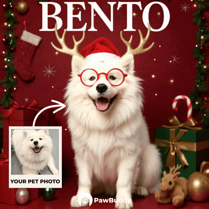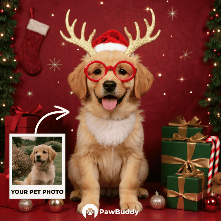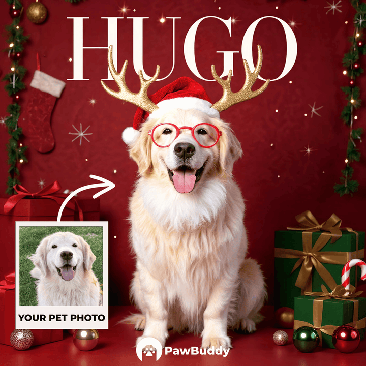 This concept showcases your pet in a vibrant, joyful Christmas scene filled with classic holiday charm. Your pet sits proudly at the center, surrounded by red-and-gold wrapped gifts, candy canes, ornaments, and festive garlands — all set against a rich red background that radiates warmth and celebration. Your furry friend is dressed in a fun, festive outfit — wearing a Santa hat, glittering golden reindeer antlers, and bright red round glasses that add a playful, stylish twist. The cozy Christmas décor and glowing background lights complete the look, creating a scene full of humor, personality, and seasonal magic. You can personalize the portrait with your pet’s name in bold white serif lettering above, styled like a classic magazine cover, or keep it without text for a timeless design. Perfect as a holiday keepsake or digital gift, this portrait captures the joyful, heartwarming spirit of Christmas — turning your pet into the adorable star of their own festive celebration.