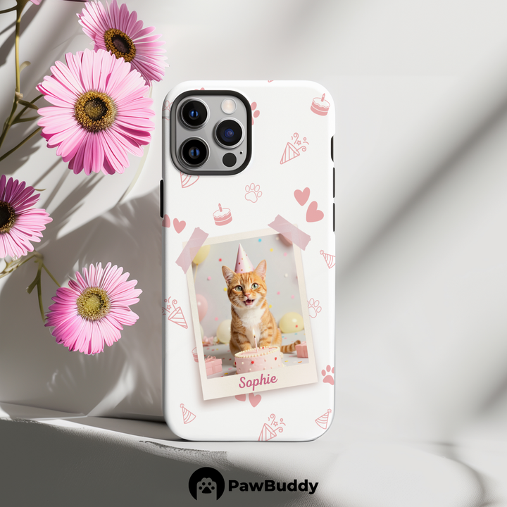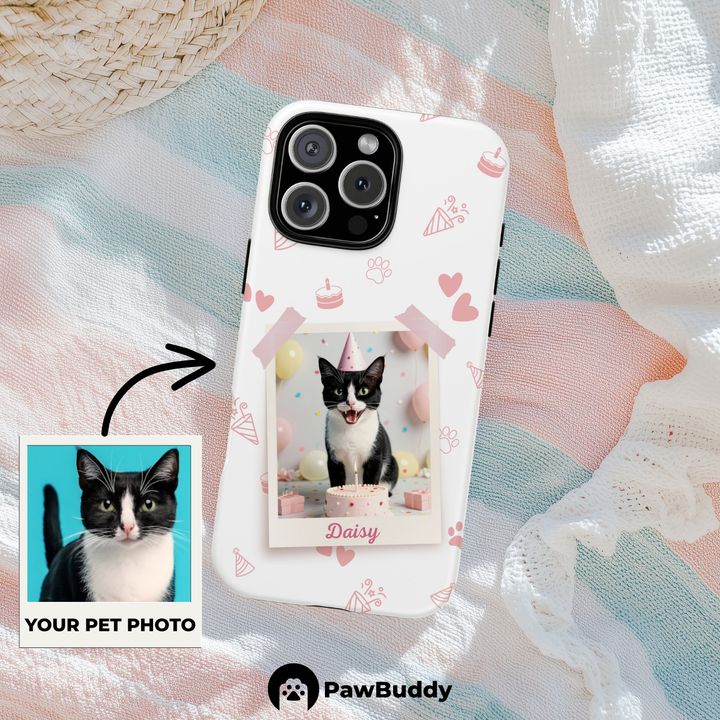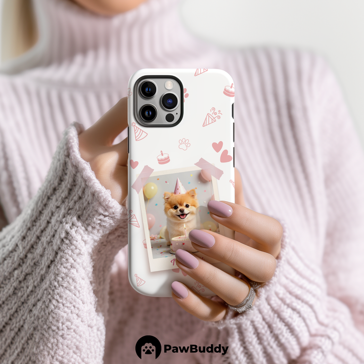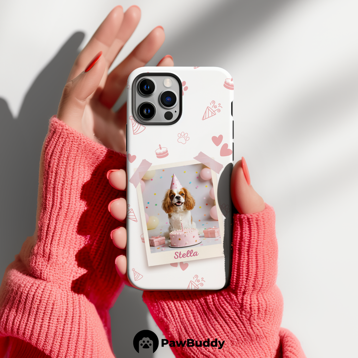 Custom Pet Phone Case for iPhone 11–17, Personalized Birthday Celebration Pink Pattern with Polaroid Photo Frame and Name, Dual-Layer Shockproof PC+TPU Protective Cover with Glossy Wraparound Printing, Unique Gift for Pet Lovers