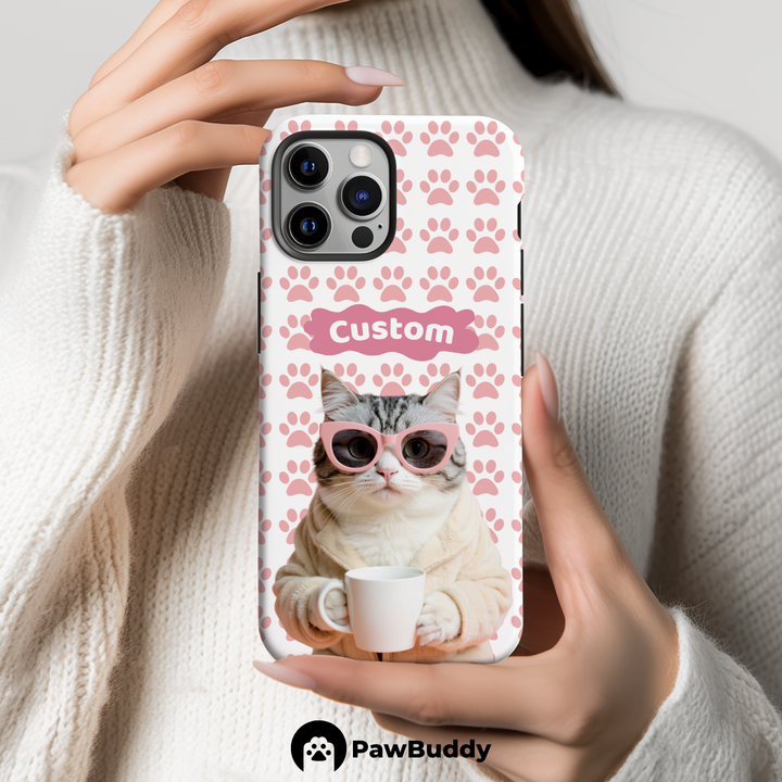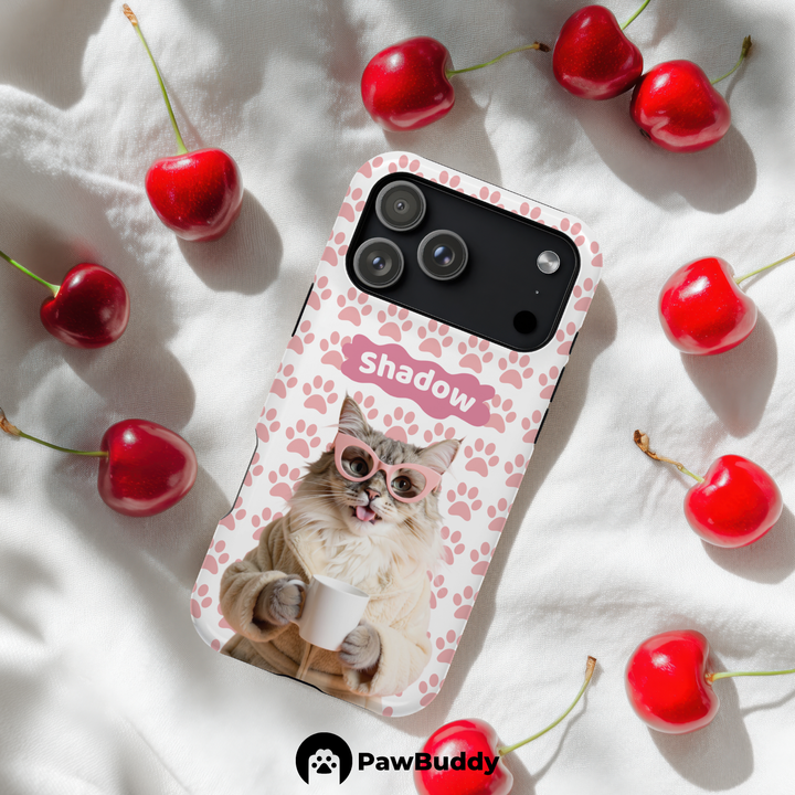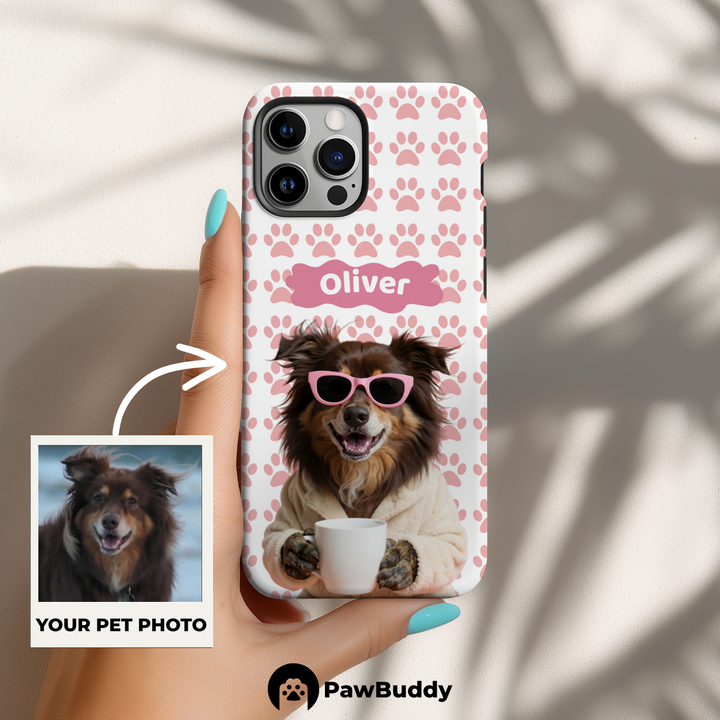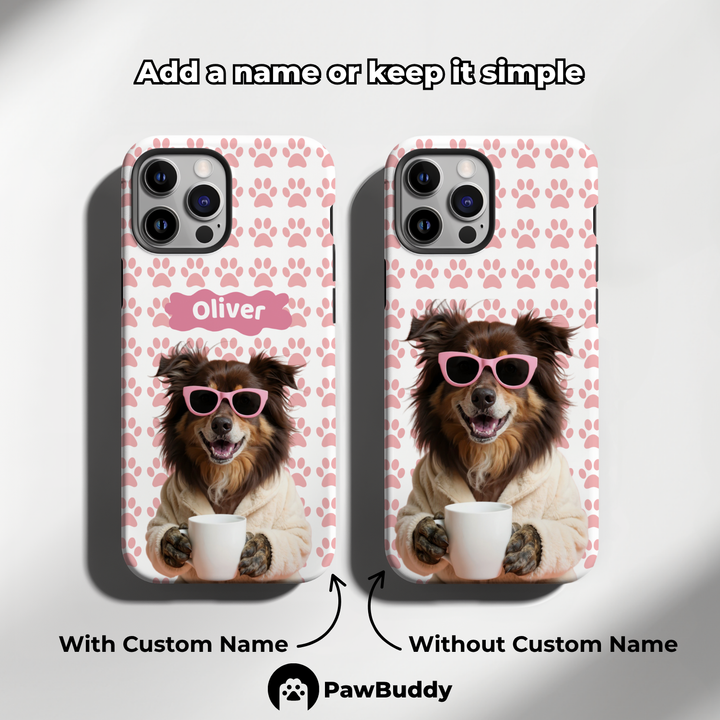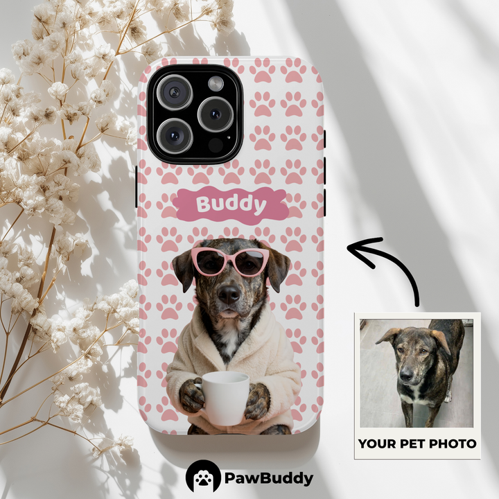 Custom Pet Phone Case for iPhone 11–17, Personalized Cozy Spa Day Pink Paw Pattern White Robe Design, Dual-Layer Shockproof PC+TPU Protective Cover with Glossy Wraparound Printing, Unique Gift for Pet Lovers
