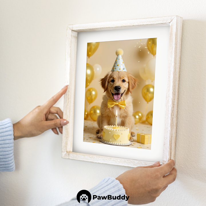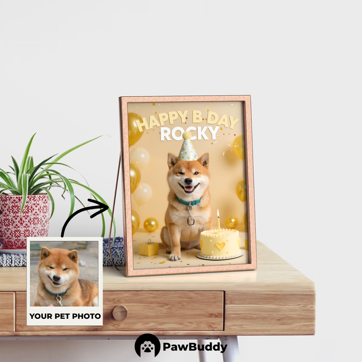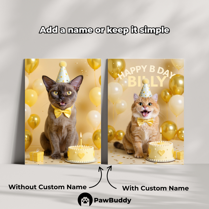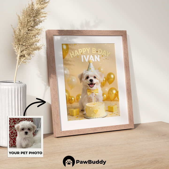 Custom Pet Poster Birthday Celebration Portrait with Gold Background – Personalized High-Resolution Matte Print for Wall Art, Home Decor, or Unique Gifts for Pet Lovers