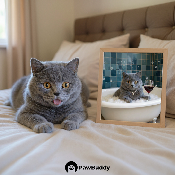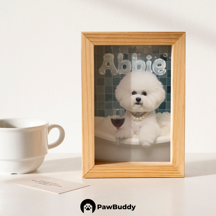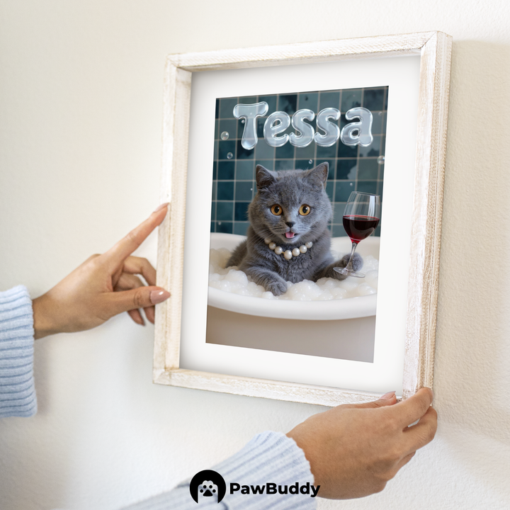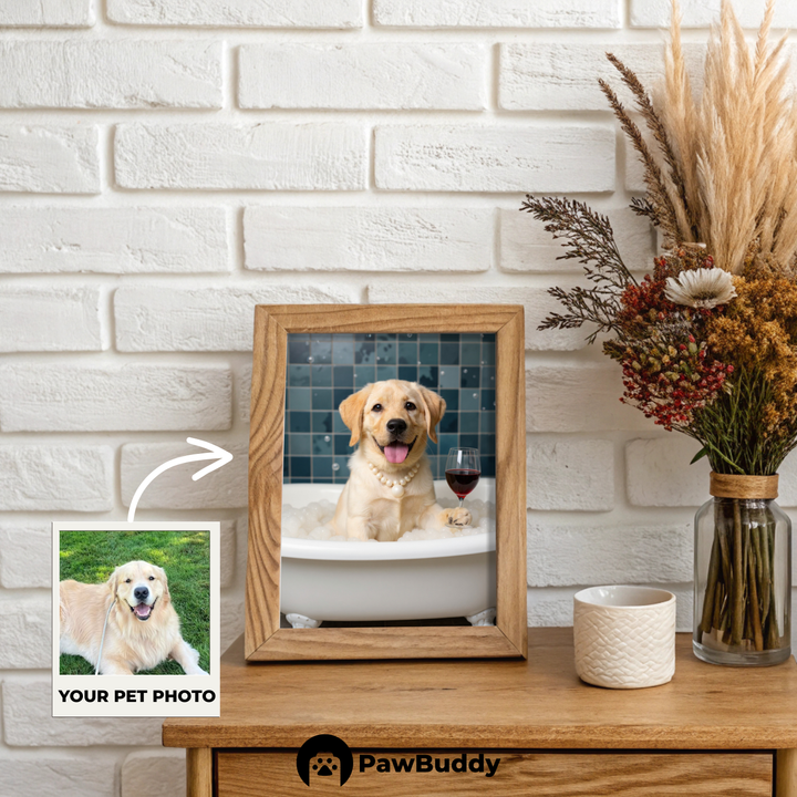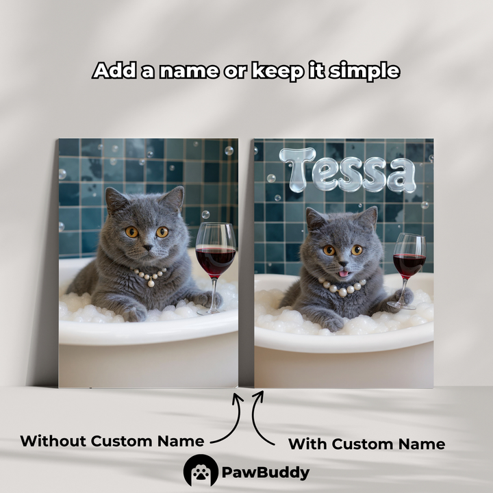 This concept showcases your pet indulging in a lavish spa moment inside a classic clawfoot bathtub, surrounded by bubbles, rose petals, and a glass of wine or champagne. You can choose from different background tile colors to suit their style. Perfect for bringing elegance and personality to your bathroom decor, while adding a playful yet sophisticated touch to any space.